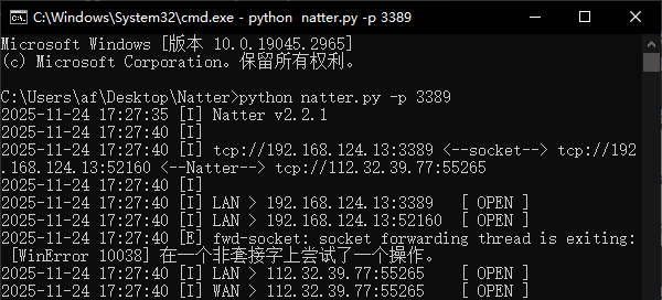 我这里使用的是 MikeWang000000/Natter: Expose your TCP/UDP port behind full-cone NAT to the Internet. ,它是一个Python编写的程序,确保你的网络为NAT1后,你可以使用一个简单的命令,如: python natter.py -p 3389 来创建STUN隧道