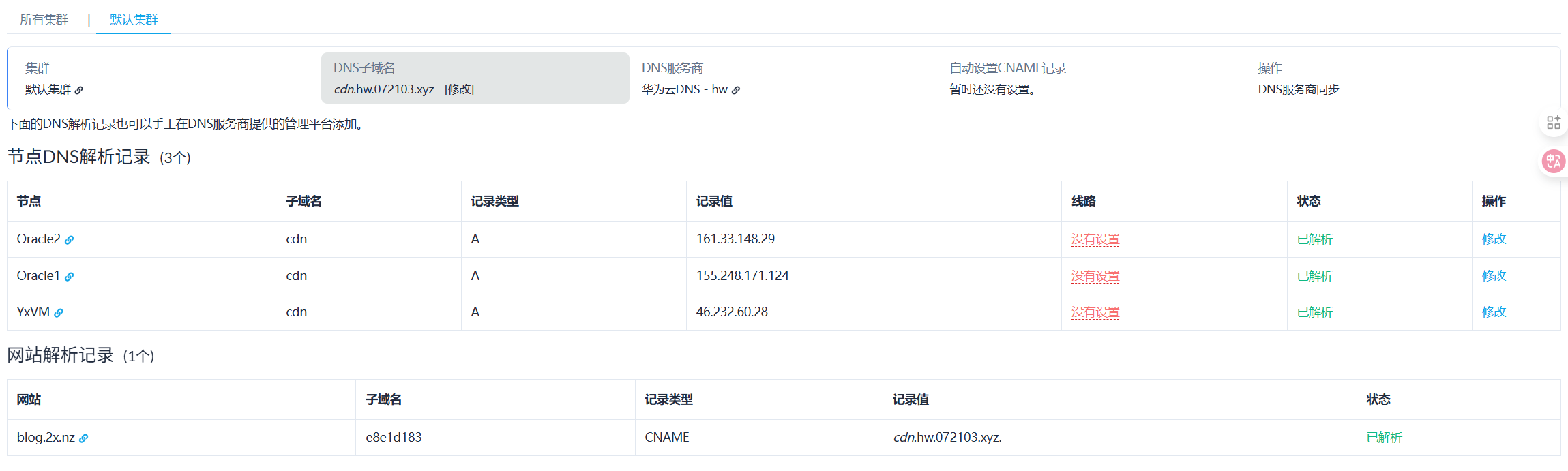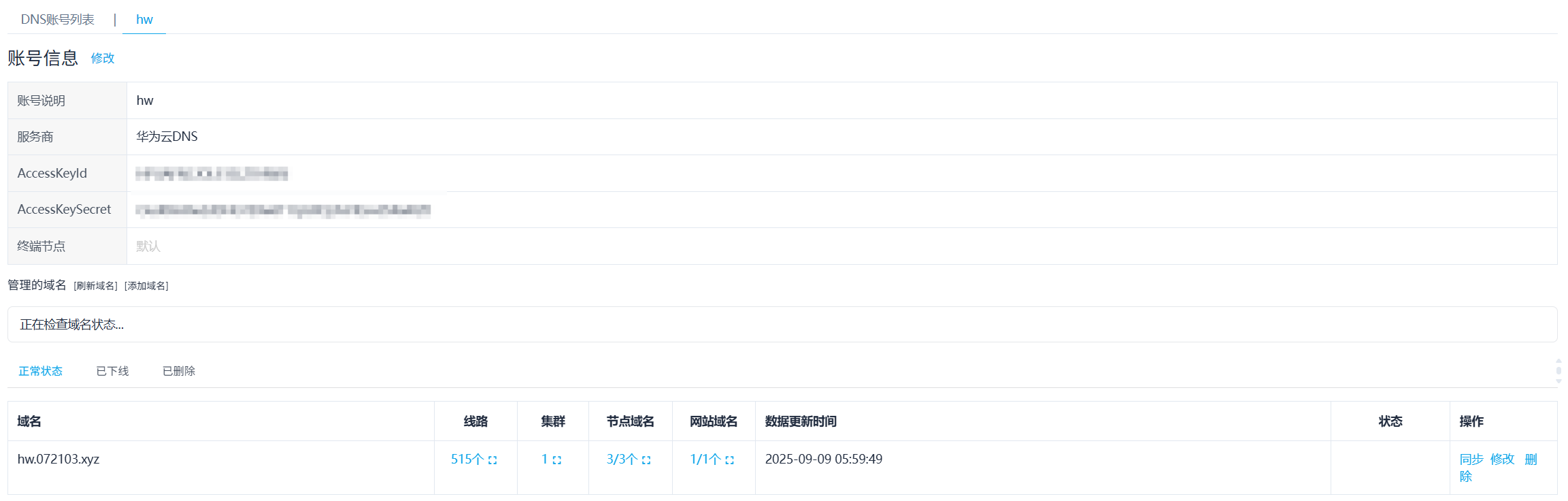 添加你的DNS账号。hw 用来做CDN域名的自治解析,cf 用来后续签发SSL