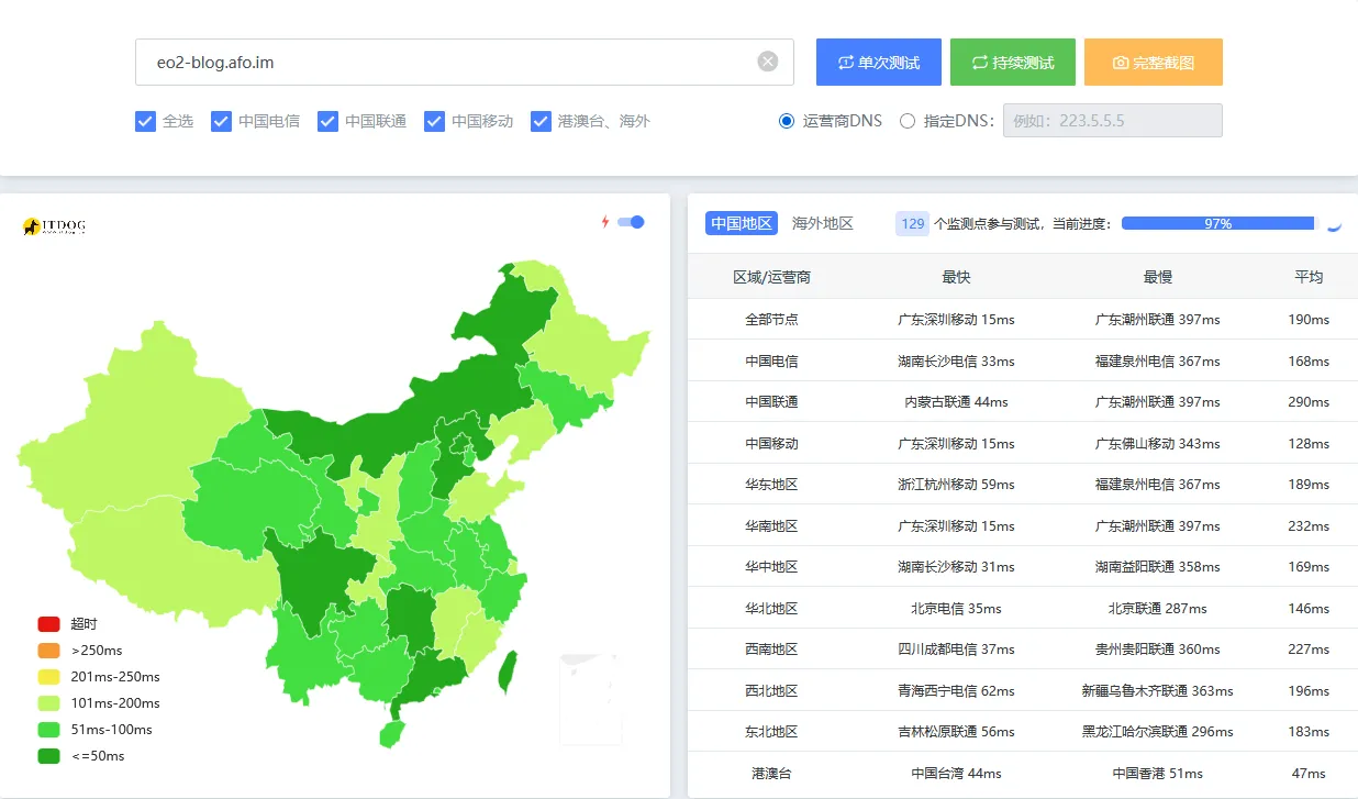 通过创建 加速区域全球可用区(不含中国大陆) 。会分配给你一个类似 eo3-blog.afo.im.eo.dnse4.com 这样的CNAME地址要求你做CNAME解析。IP很烂。可以直接做优选。 获取方式很简单,直接ITDOG PING edgeone.ai 找个最快的IP直接写A解析(貌似国内的也可以🤔),如图。本人EdgeOne优选: eo.072103.xyz