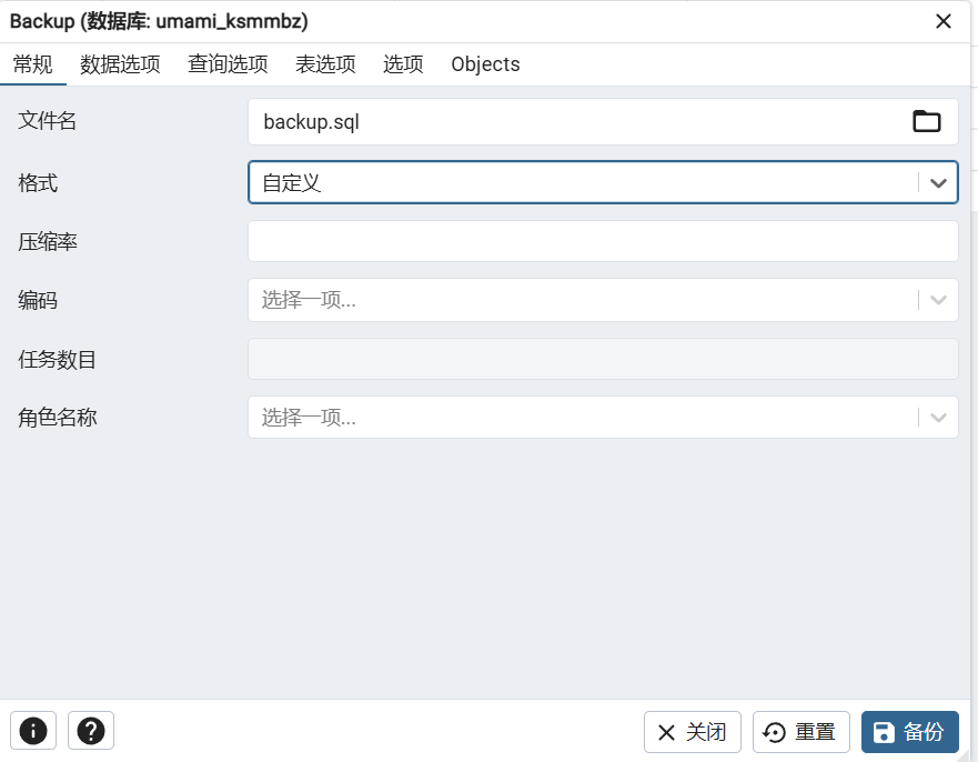 填写 文件名 创建备份。备份的文件将会保留在 pgAdmin4 上