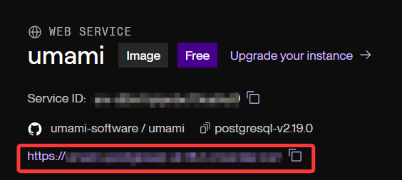 Source Code 选择 Exist Image ,并输入 ghcr.io/umami-software/umami:postgresql-v2.19.0 最好选最新版,也就是 vx.xx.x 这个字段