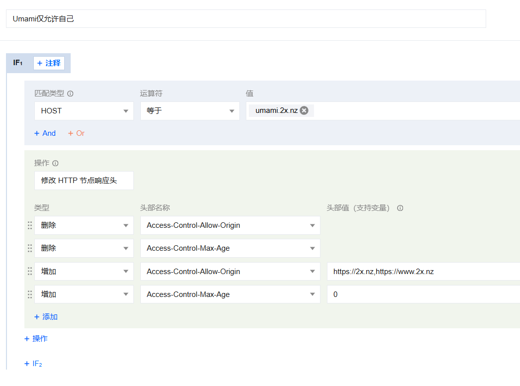 由于 Umami 没有独立的CORS设置,如果不设置CORS则他人将可以随便刷你的Umami,这会导致统计不准确,详见 这篇文章 。我们可以接入EdgeOne CDN来变相支持CORS
