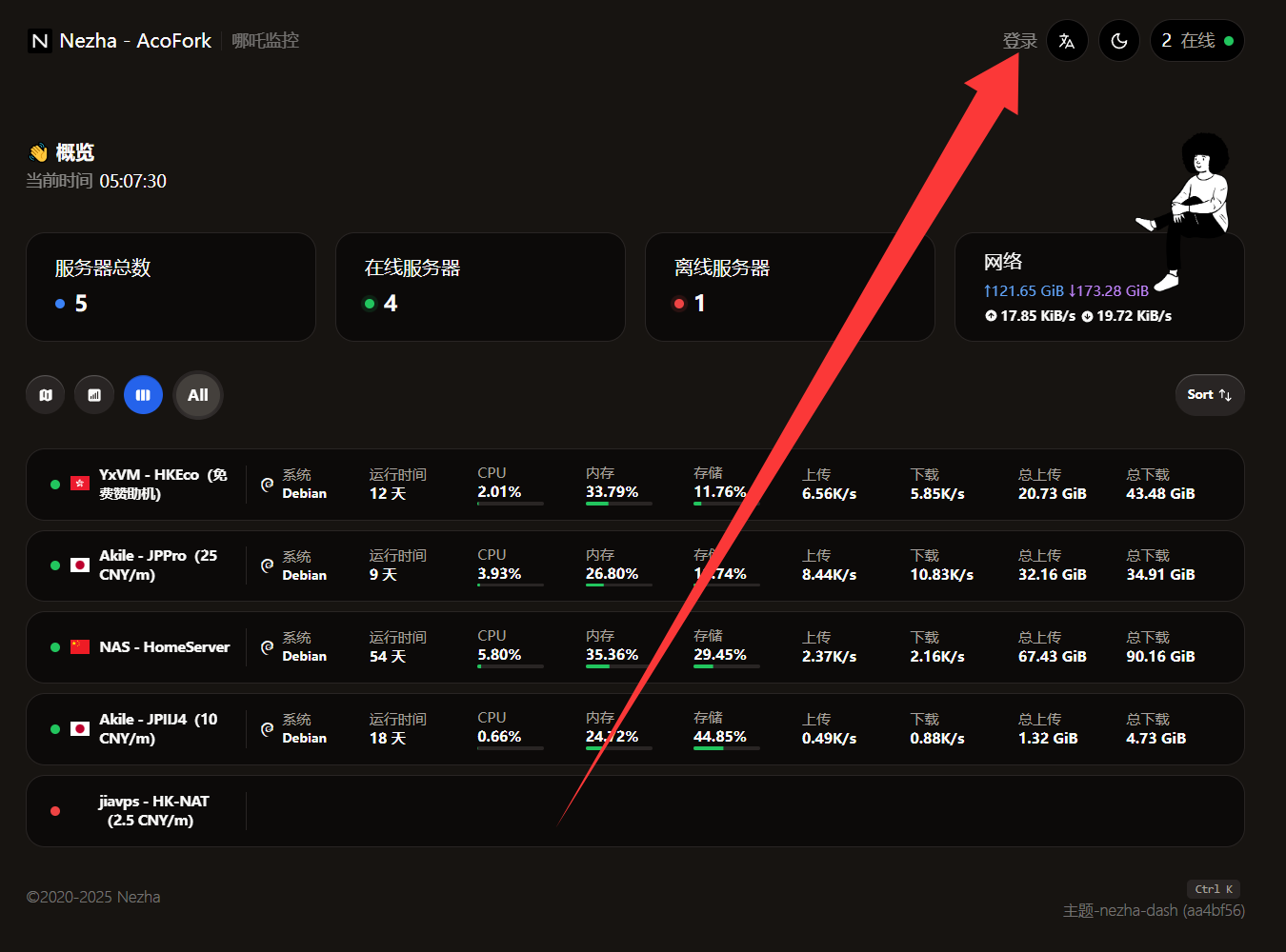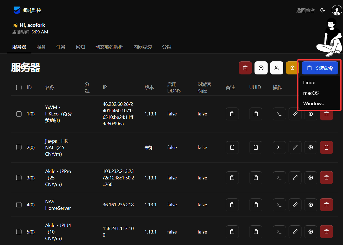 打开哪吒探针的WebUI,在服务器一栏可以找到安装命令,选择对应系统的,然后前往终端执行即可。稍后你将会看到一个随机名称的新服务器上线