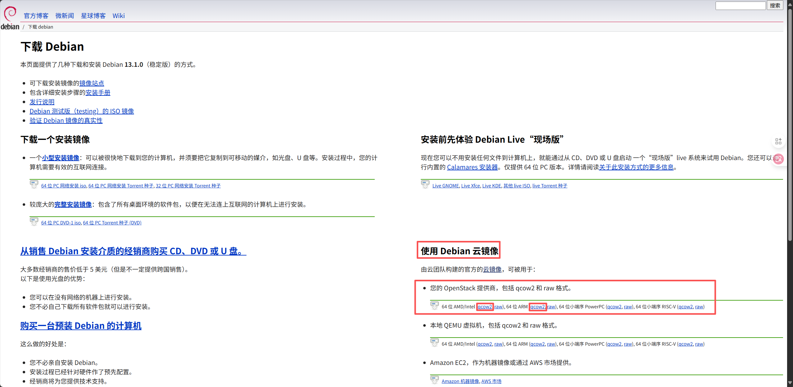 首先下载适用于云的Debian映像,进入 下载 Debian ,找到 使用 Debian 云镜像 分别下载