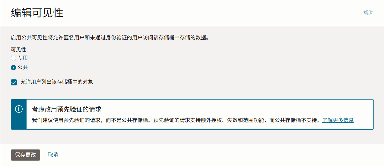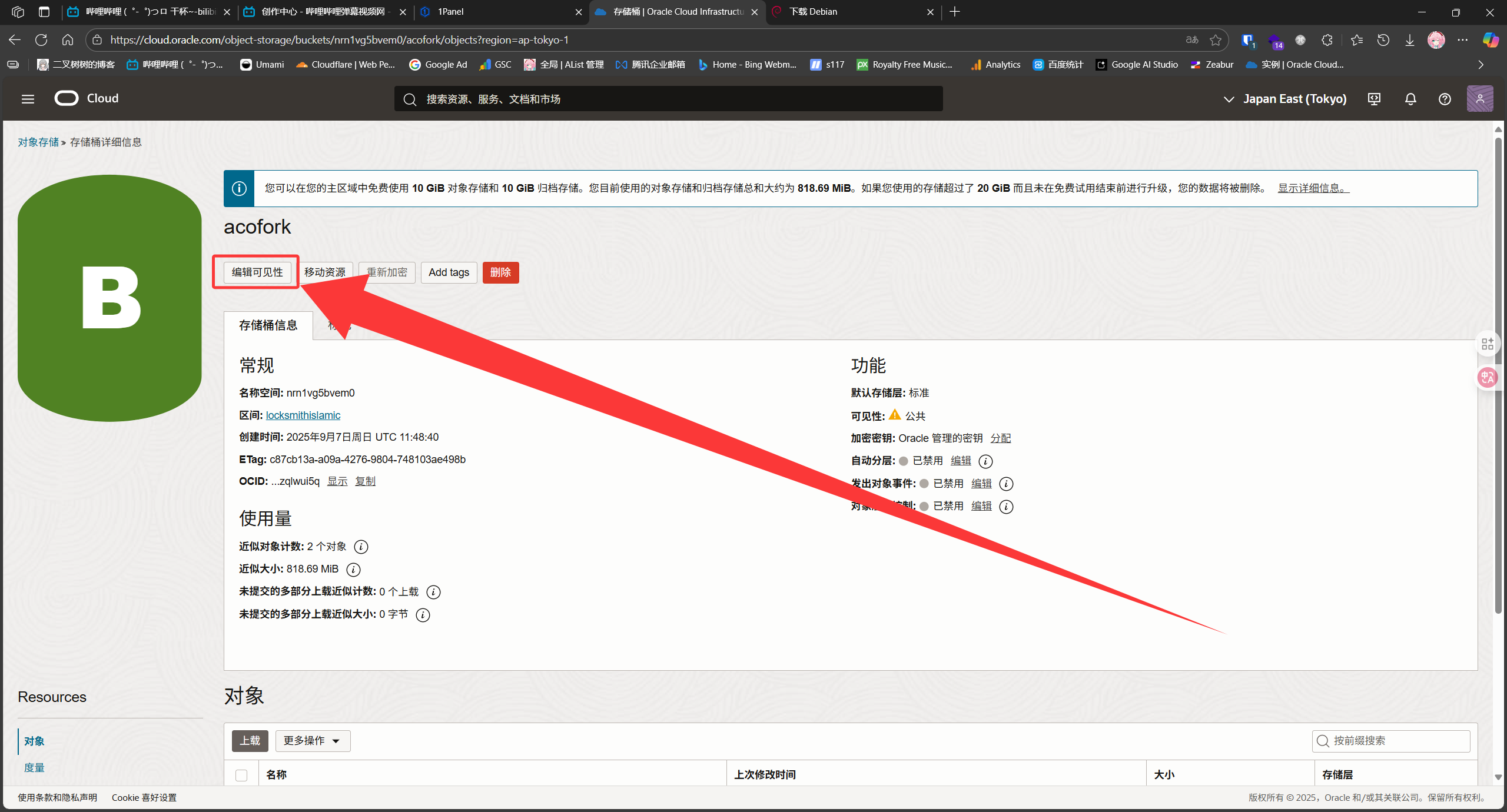 前往 https://cloud.oracle.com/object-storage/buckets 创建一个新存储桶,点击编辑可见性,改为 公共