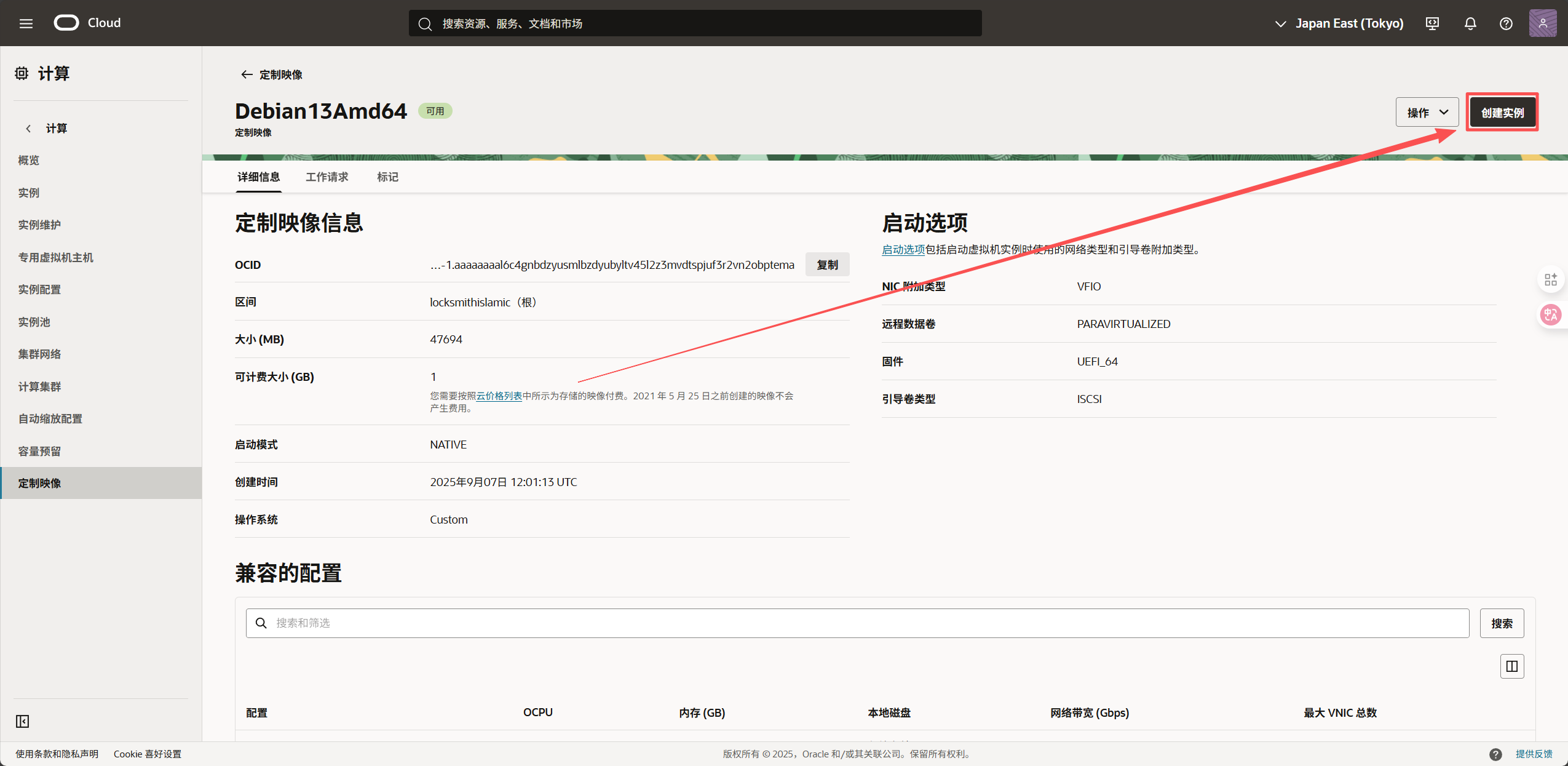 如果你前往 https://cloud.oracle.com/compute/instances/create 尝试创建实例。会发现没有 Debian 映像 。我们可以通过最下面 我的映像 来上传自己的自定义映像,详细步骤往下看