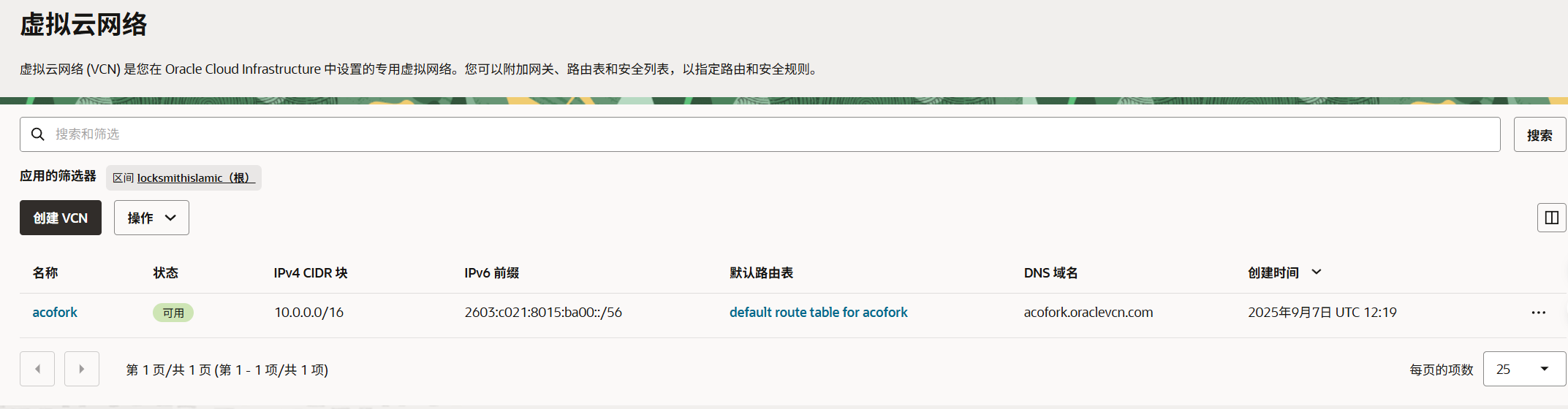 前往 https://cloud.oracle.com/networking/vcns 点击 创建VCN 改个名称然后一路下一步即可
