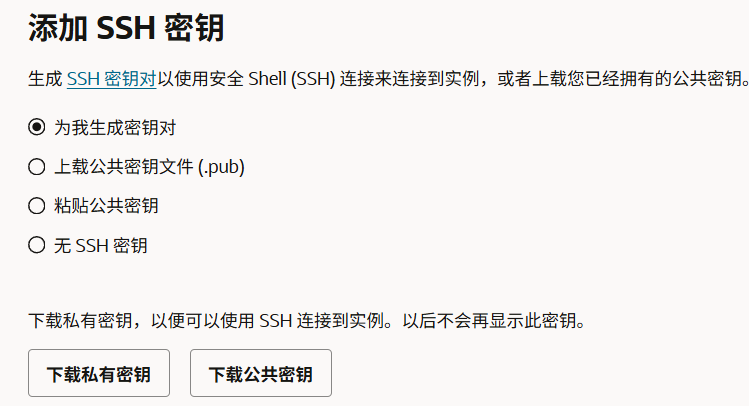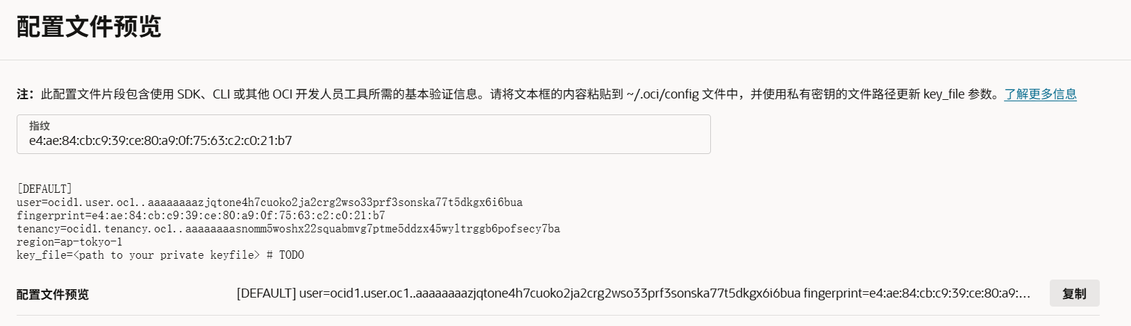 前往 https://cloud.oracle.com/identity/domains/my-profile/auth-tokens 点击 添加API密钥 并 下载私有密钥(只能下一次) ,然后会弹出 配置文件预览 ,复制它,后面要用