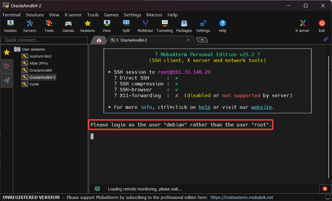 意为: 请使用名为 debian 的用户登录而不是 root 用户