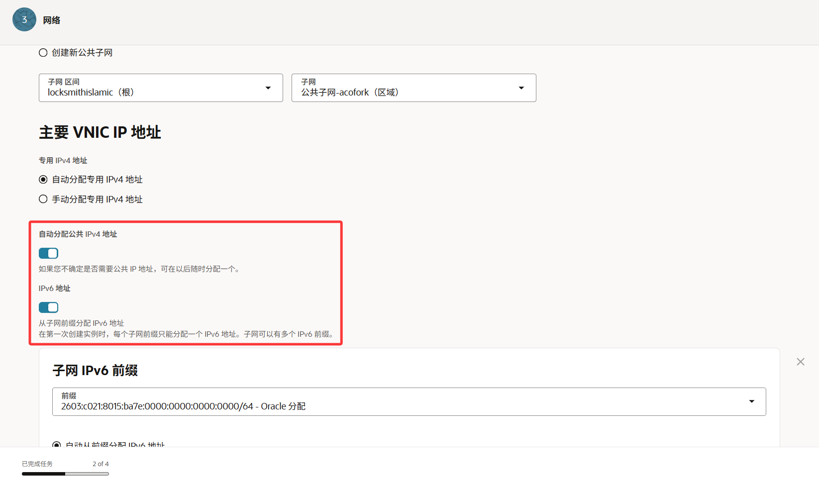 在这里可以选择是否附加 IPv4 和 IPv6 地址,其中, IPv6 地址的附加功能取决于是否在VCN附加了 IPv6前缀