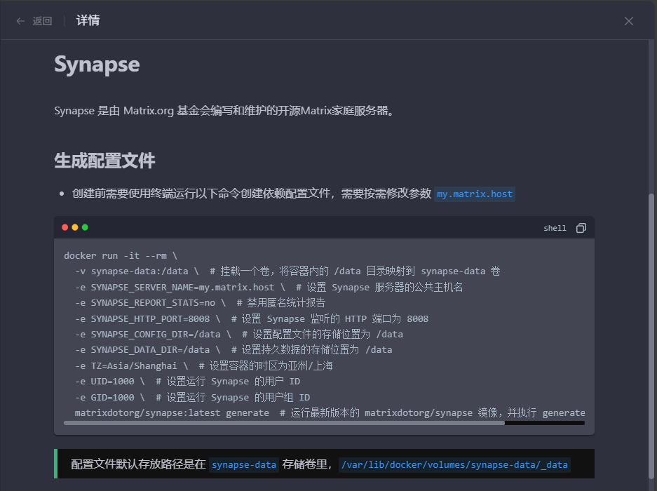 首先参照1Panel官方的教程去创建一个存储卷,否则安装 synapse 会失败