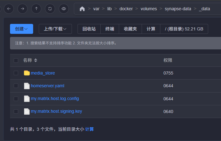 导航到文件管理: /var/lib/docker/volumes/synapse-data/_data
