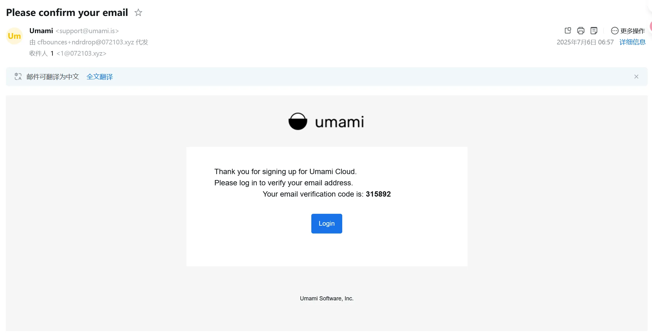 然后检查你的邮箱,是否收到了Umami的邮箱验证消息