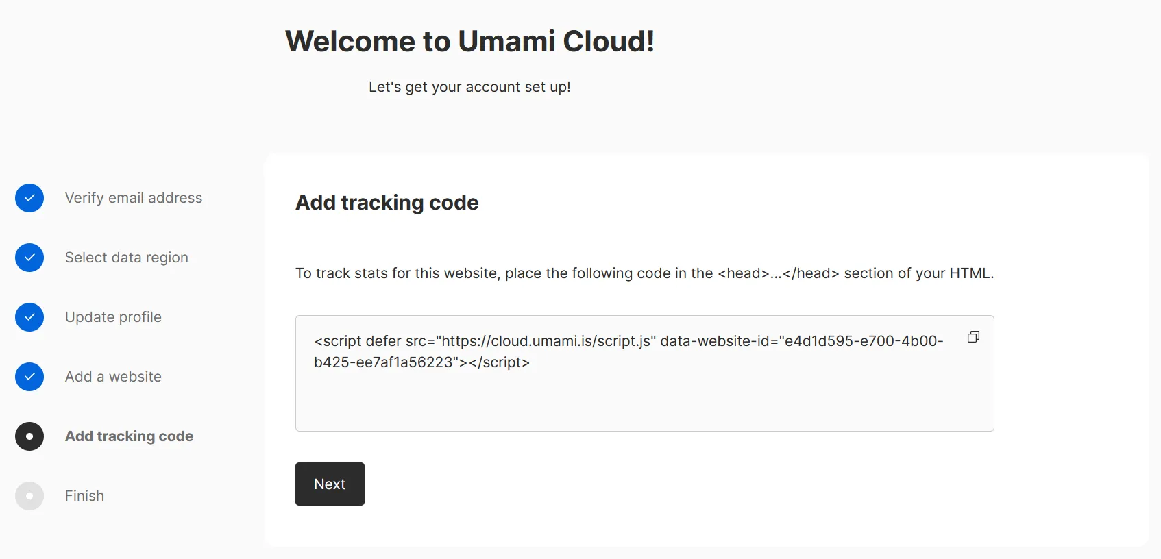 将跟踪代码插入到你的网站的 <head>Umami跟踪代码</head> 中