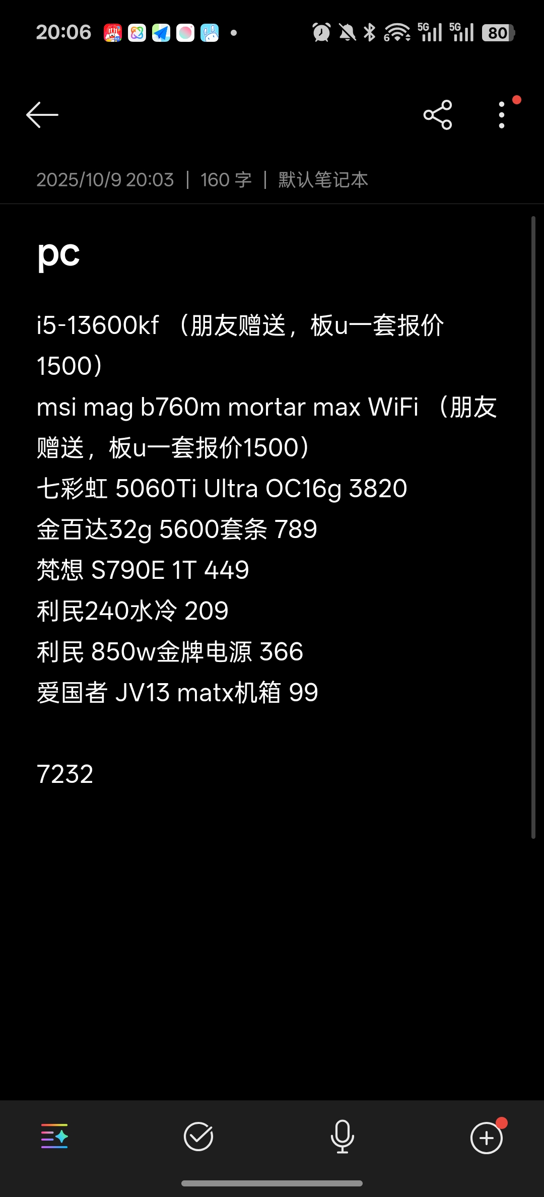 恰巧,朋友准备换CPU了,又恰巧,要从Intel换成AMD,也就是说,他的主板和U都闲置了,就问我要不要。那我肯定是求之不得,然后便顺理成章的拿到了板U,接下来只需要自己买显卡内存硬盘电源散热机箱即可,因为板U暂时不需要我掏钱了,所以预算非常充足,又因为我这个人心急吧,于是便找了 京东当日达 也就是本地仓发货的,可能要加个几百块,但是刚好可以治我的“心急病”,但是吧,朋友的板U本来是走飞机的,但是安检没过,所以转陆运了,那么陆运就不能当日达了,也就是说就算我的其他配件当日达,板U不能当日达那我这加的钱就是白加,不过算了,既来之则安之,那么以下是我的配置单