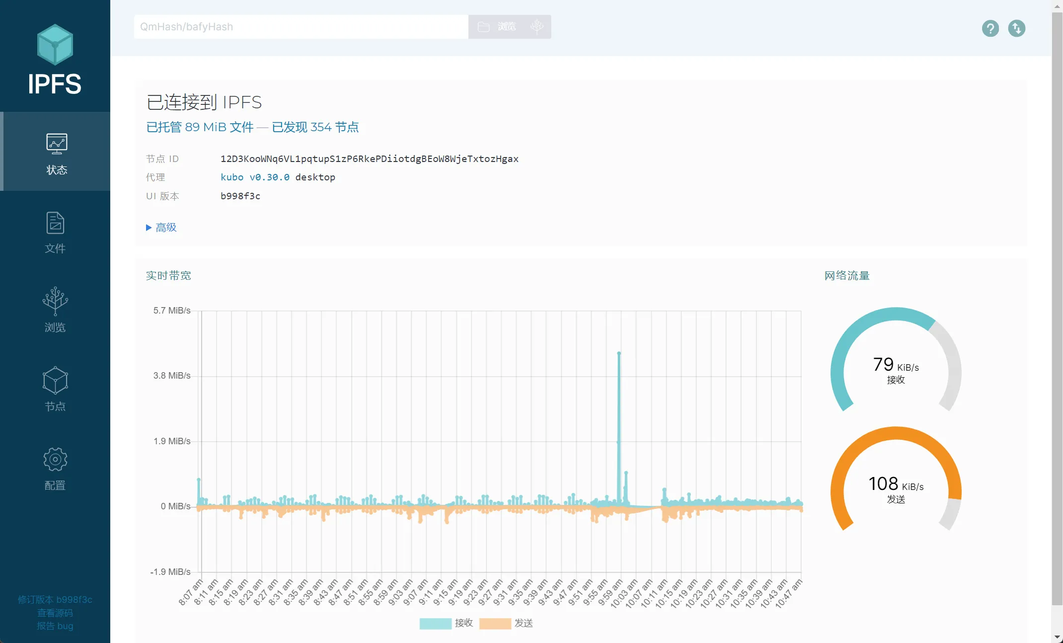 用人话说,你可以把它看成一个共享网盘,你可以尝试下载IPFS - Desktop(适用于有图形界面的系统)或kubo - ipfs(适用于CLI)。然后启动IPFS,你的设备将成为IPFS网络中的一个节点,如图