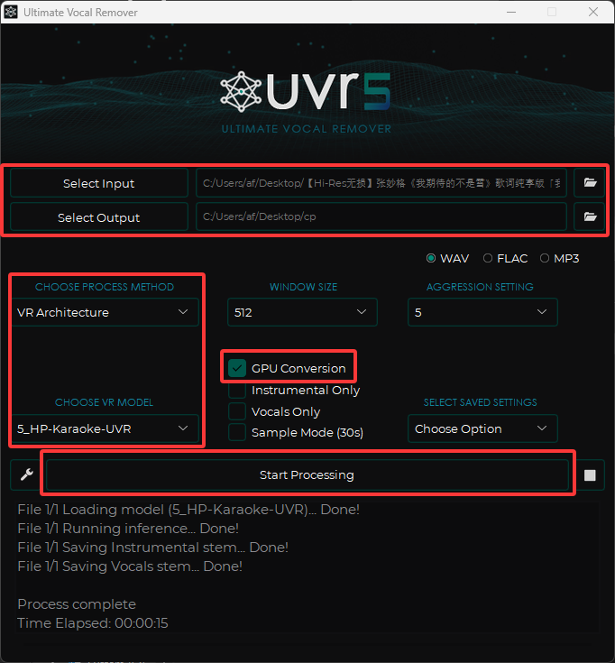 CHOOSE VR MODEL 选择我们刚刚下载的 5_HP-Karaoke-UVR 模型