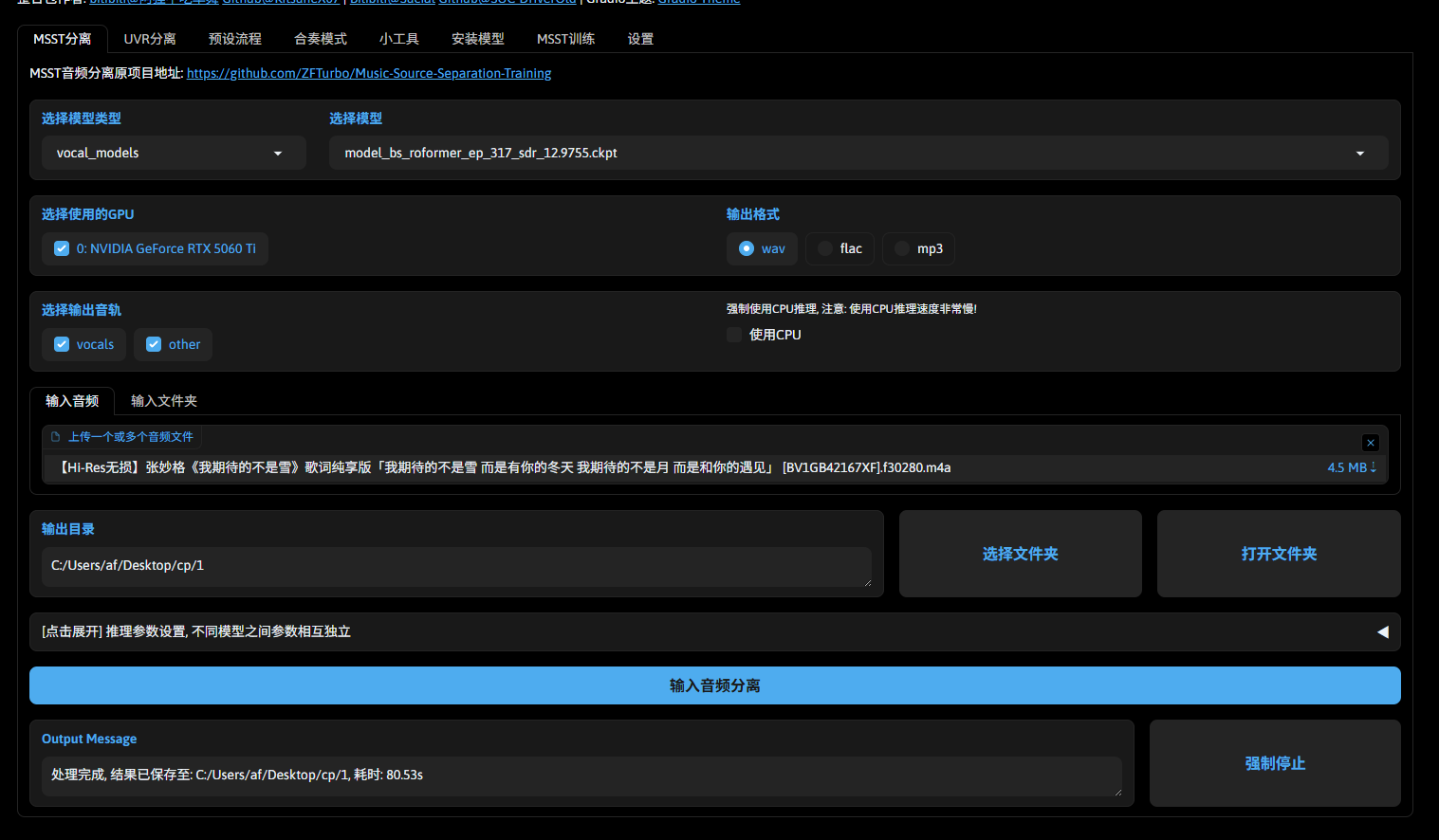 然后都是字面意思了,随后点击 输入音频分离 开始转换
