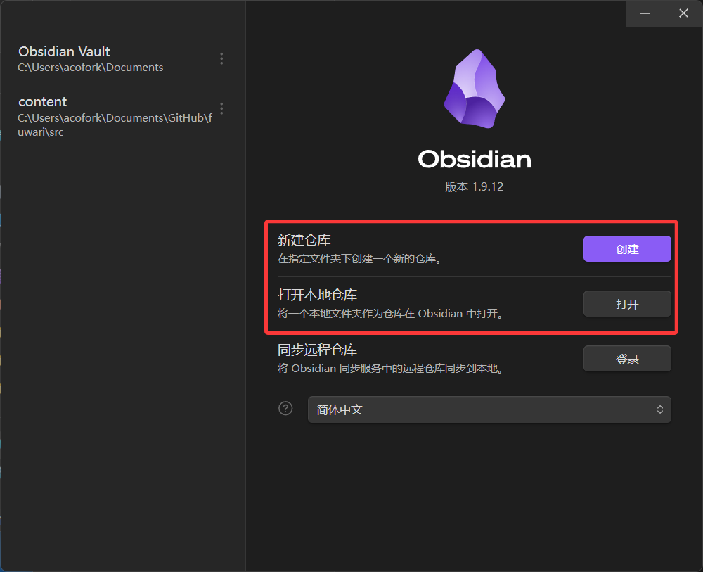 前往 Download - Obsidian 下载对应你系统版本的软件。安装界面就可以选择语言为 简体中文