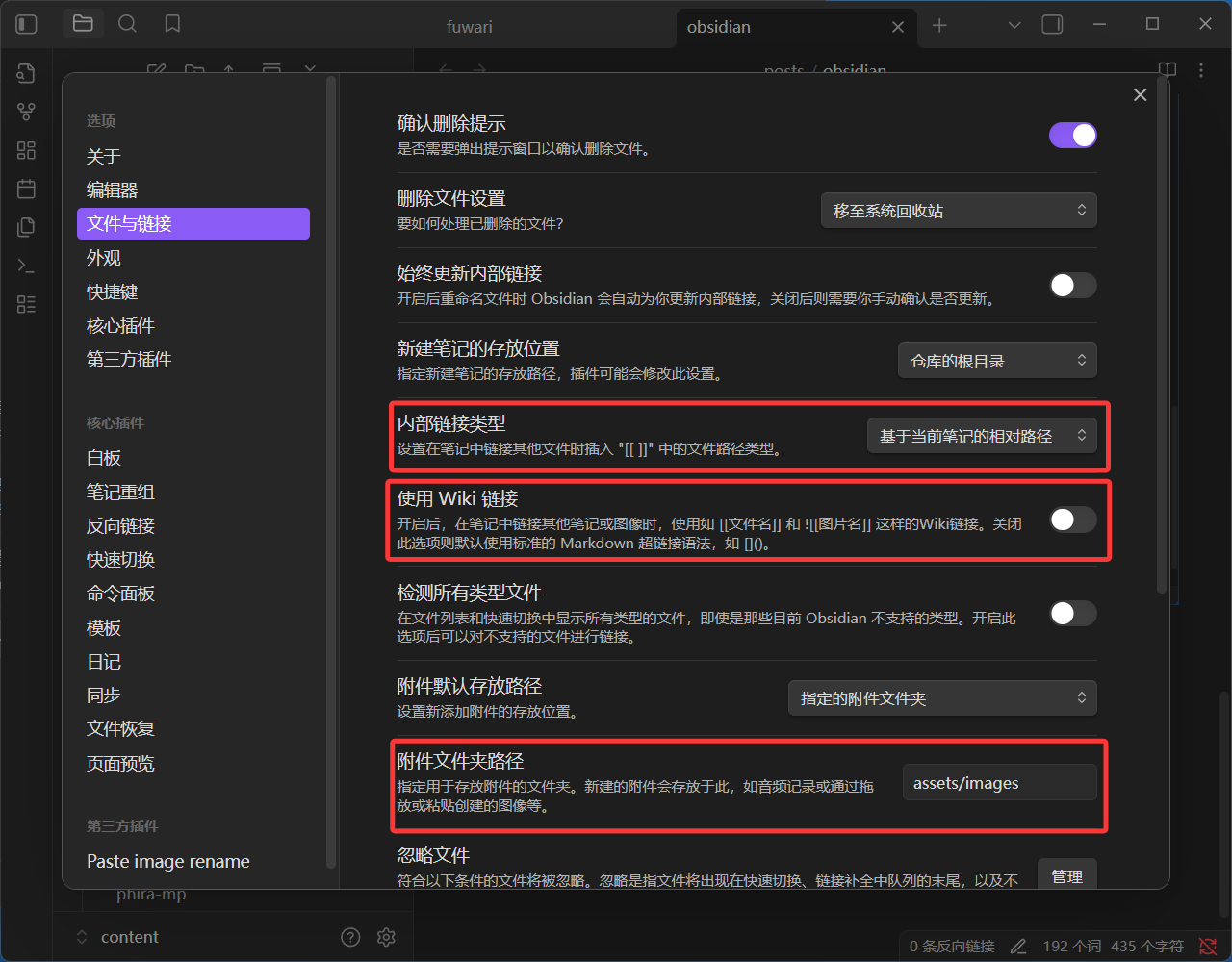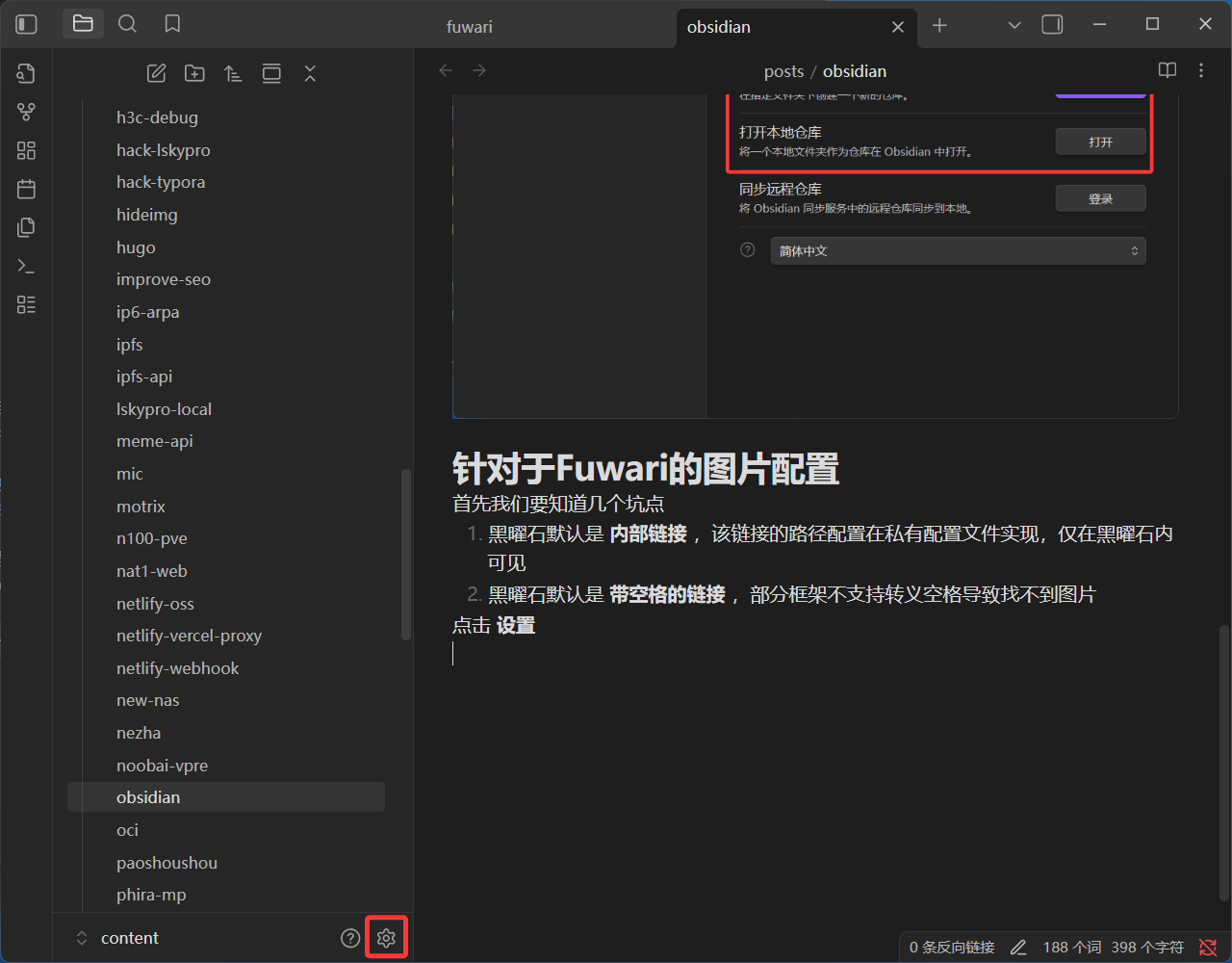 src/content作为仓库根目录,因为src/content/posts存放博客文章,而src/content/spec存放关于等特殊MarkDown页面,他们都可能需要依赖图片,所以建议将仓库设置在他们的上一级文件夹。我们的图片将存放在src/content/assets/images在posts或spec的相对路径引用格式则为../assets/images/xxx.png(不用担心,黑曜石会自动管理,你无需手打) 点击 设置 如图配置,这样我们就解决了第一个问题