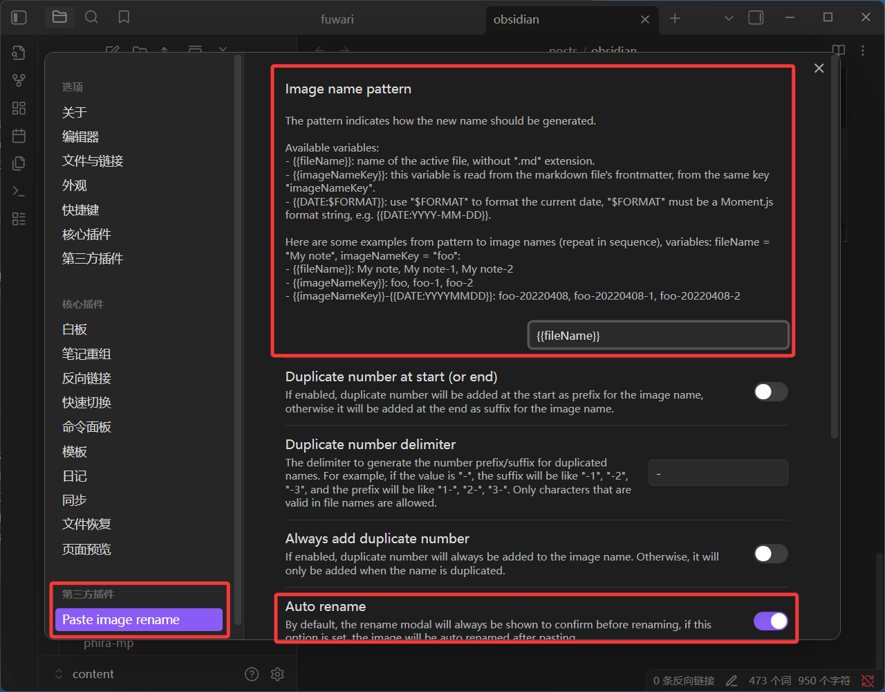 设置 - 第三方插件 - 安全模式(关闭)然后依次设置 - 第三方插件 - 社区插件市场(浏览)安装Pasts image raname并 启用 再次前往 设置 ,在最底下就会有一个专门配置第三方插件的配置项目 第一个Image name pattern不用动,如果你要更改,请确保你知道自己在做什么,该配置描述已经非常详细了 第二个Auto rename,将它打开,如果你不想每粘贴一个图片就弹出一个对话框让你输入图片名称的话 接下来,尝试使用任一截图工具,如 QQ截图 ,截图后使用 Ctrl+V 粘贴进文章,你应当能看到类似这样的图片链接了