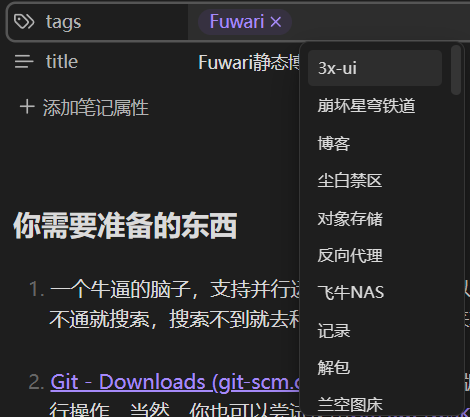 .obsidian ,存放了工作区的配置信息 注意: 黑曜石的配置都是针对于单个仓库的,若该配置文件丢失你需要重新配置黑曜石。所以,请确保写文章时不要频繁更改仓库针对于Fuwari的图片配置